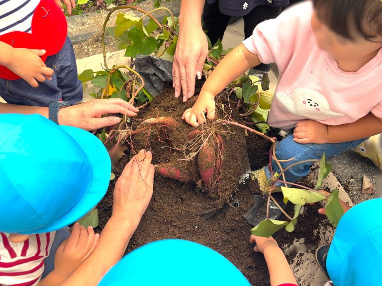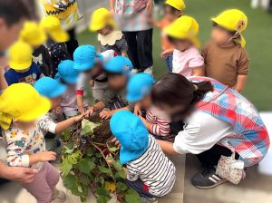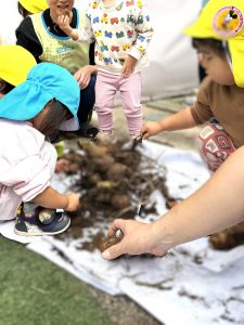 袋を裂いて、土をみんなでほりほり・・・「おいもころころおいもチャチャチャ♪」とおいもの歌を口ずさみながら、次々にでてくるおいもに大喜びの子ども達☆