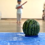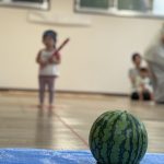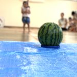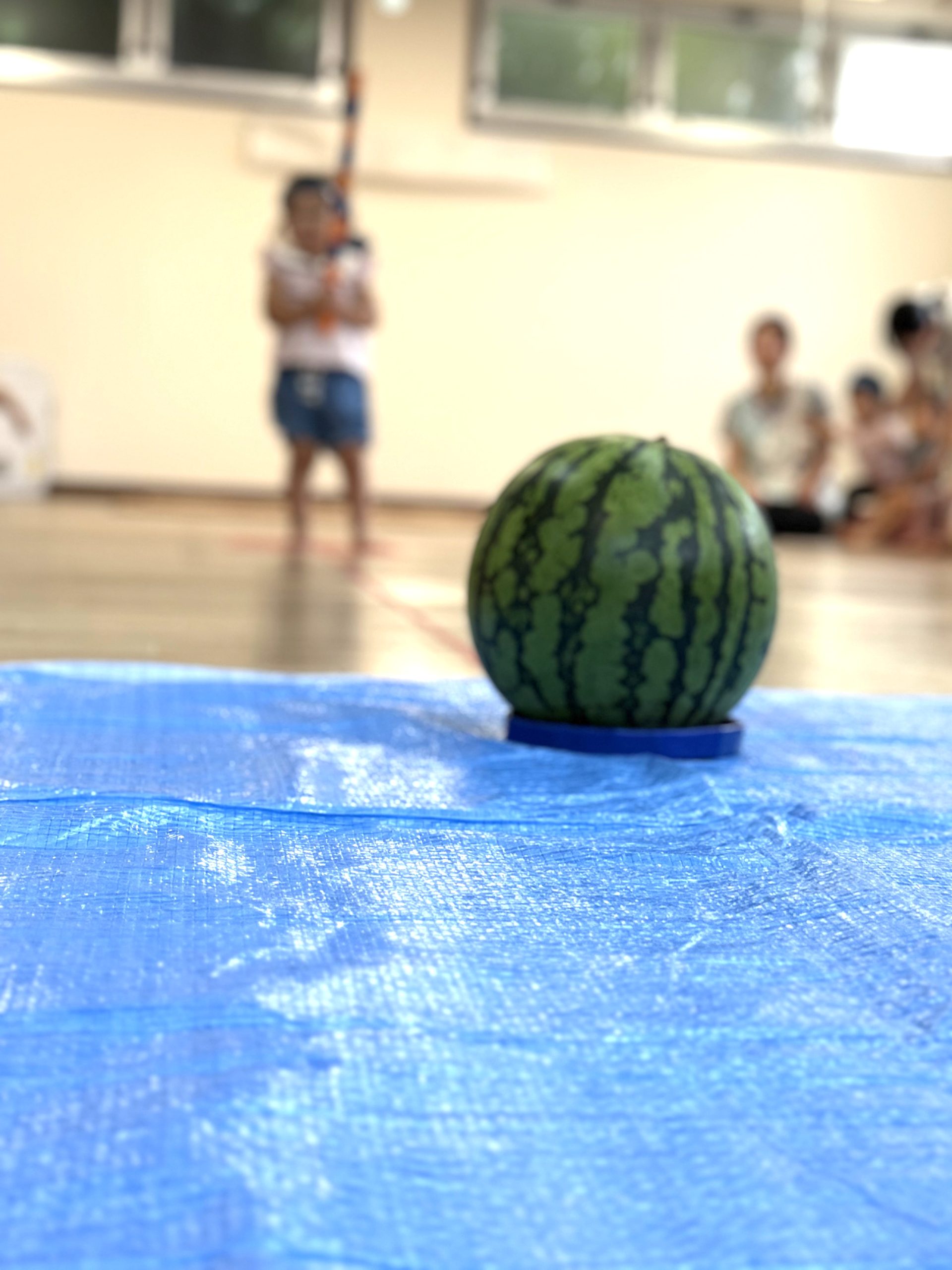 事前に保育士が段ボールで作ったスイカで割る練習をしていた子ども達。