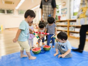 第二にじのいろ保育園の夏の恒例イベント「スイカ割り」